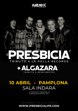 La Gira de PRESBICIA (Tributo a La Polla Records) junto a ALGAZARA (Tributo a Reincidentes) aterriza en MADRID para hacerte pasar una noche única. El proyecto PRESBICIA liderado por el actor DANIEL GUZMÁN rinde homenaje desde el corazón a uno de los músicos que más le ha influido en su vida, Evaristo Páramos, dando un extenso repaso a esos temas que aún siguen más presentes y vivos que nunca.